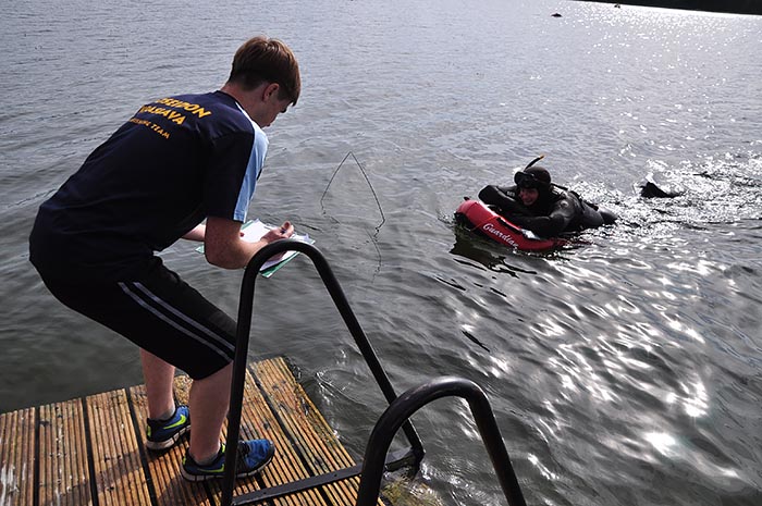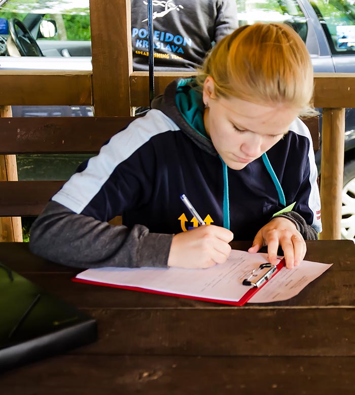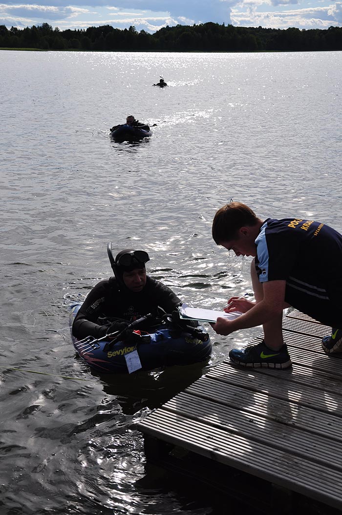 При регистрации каждому спортсмену выдается номерок, который находится у него все время соревнования (с собой в воде).