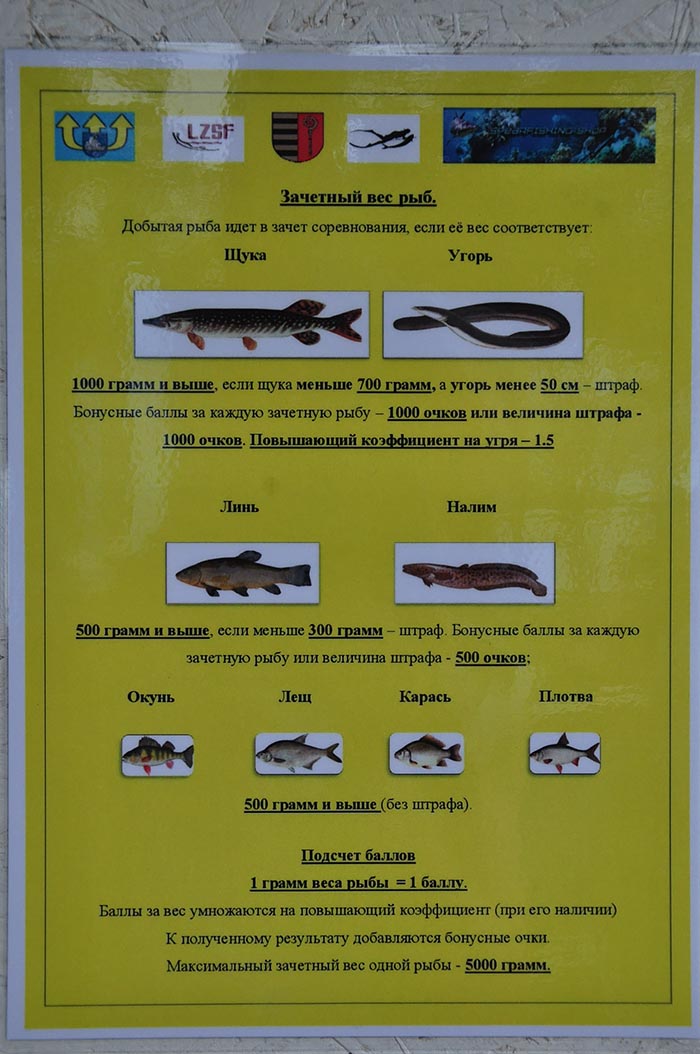 если щука меньше 700 грамм, а угорь менее 50 см – штраф. Бонусные баллы за каждую зачетную рыбу – 1000 очков или величина штрафа - 1000 очков. Повышающий коэффициент на угря – 1.5