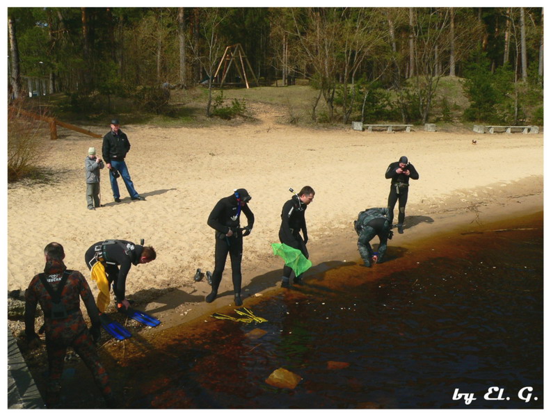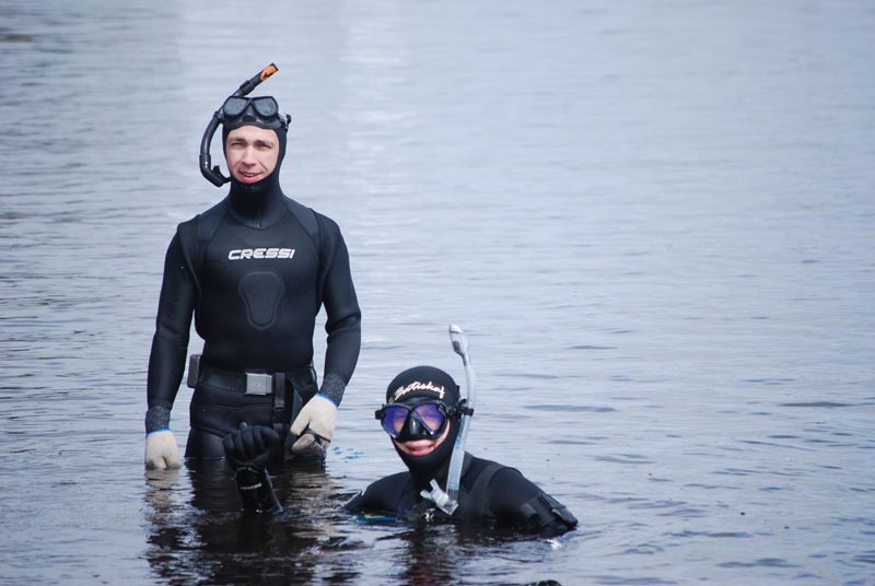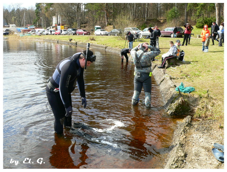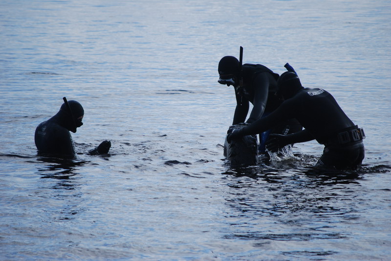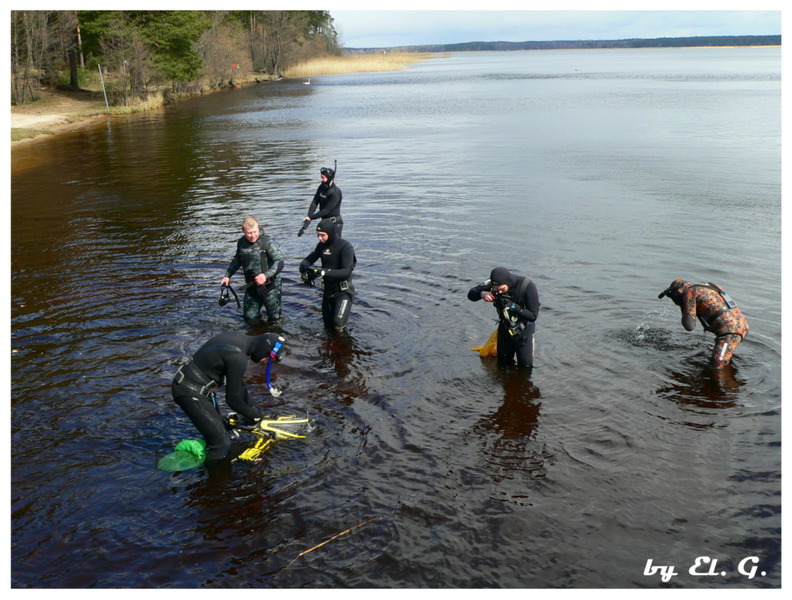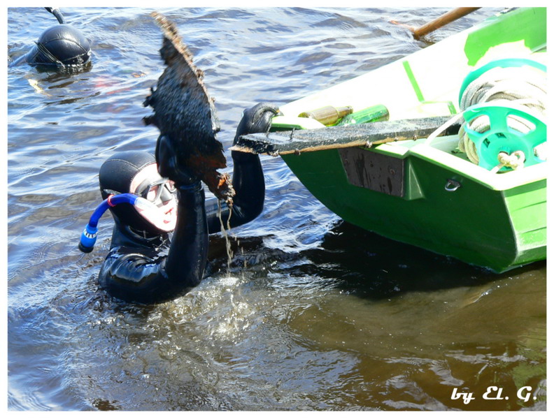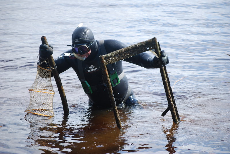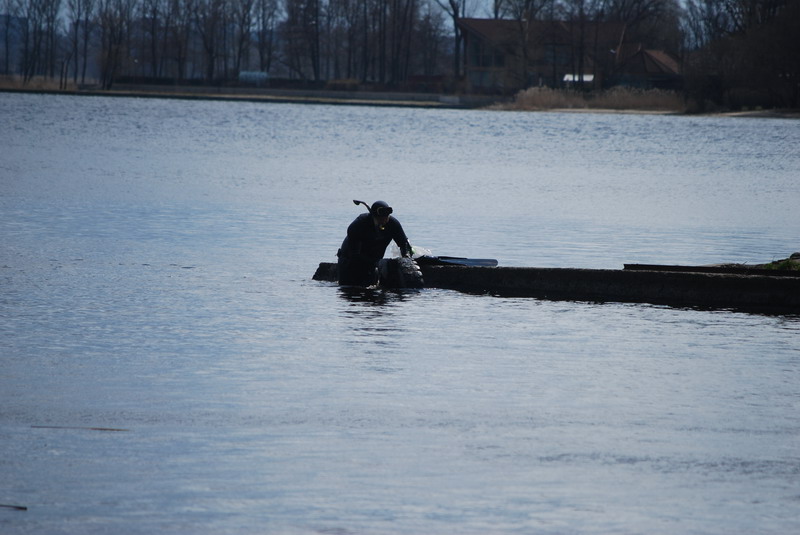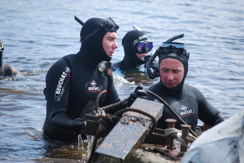 Участники разбиваются на две группы, одна занимается очисткой прибрежной зоны со стороны суши, вторая чистит подводную часть.
