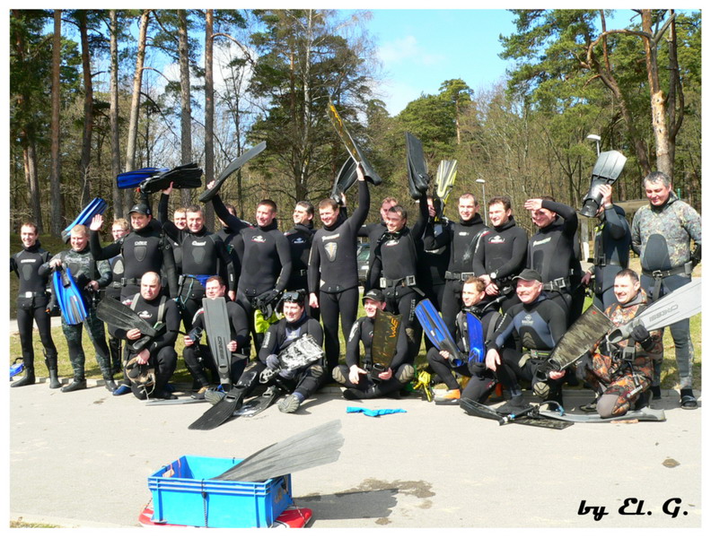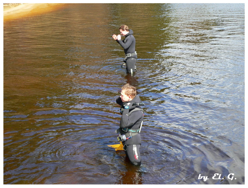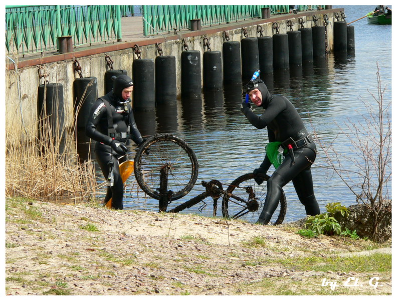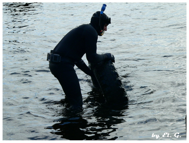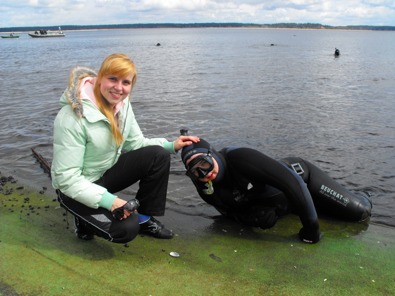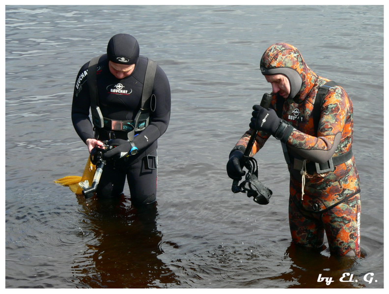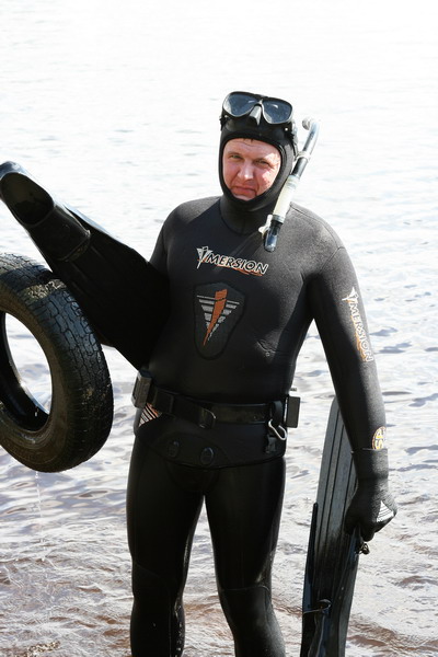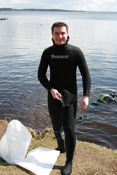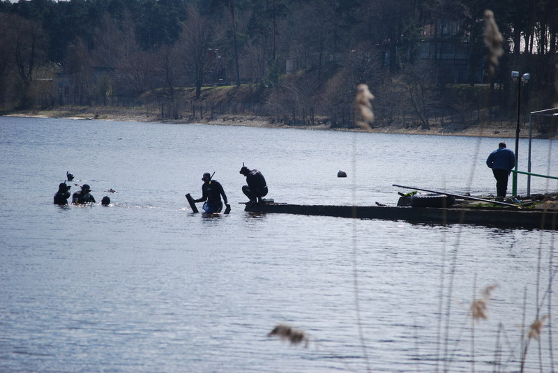 Участники разбиваются на две группы, одна занимается очисткой прибрежной зоны со стороны суши, вторая чистит подводную часть.